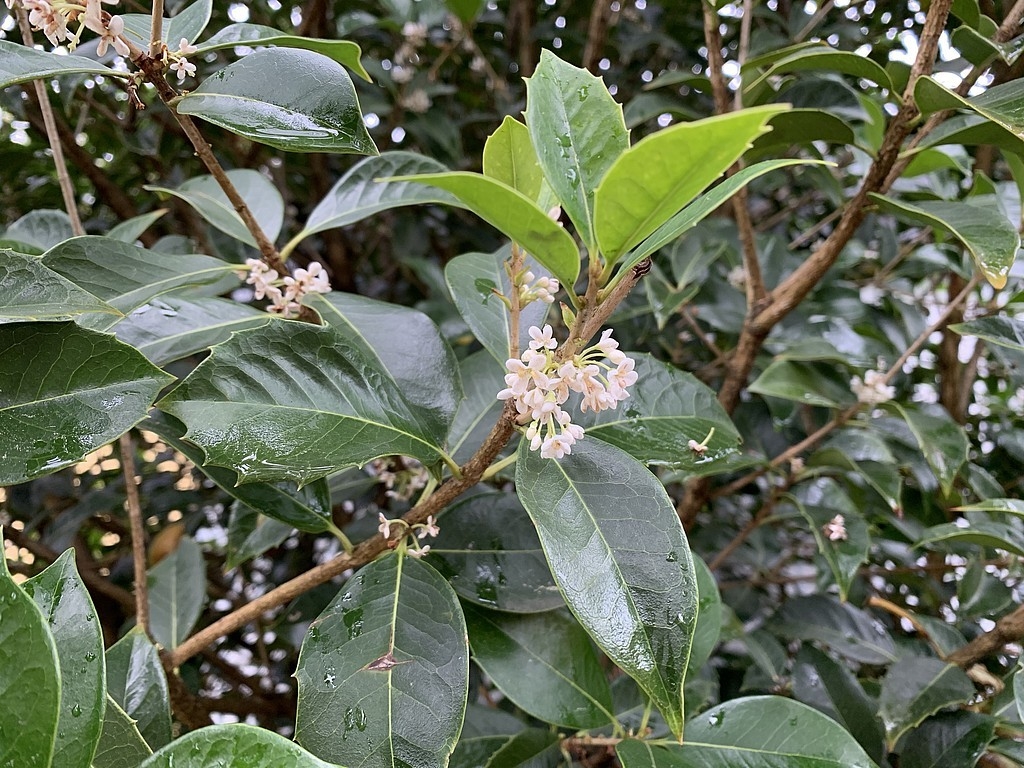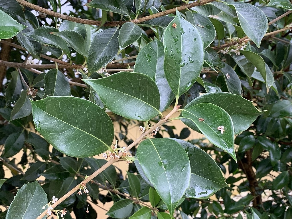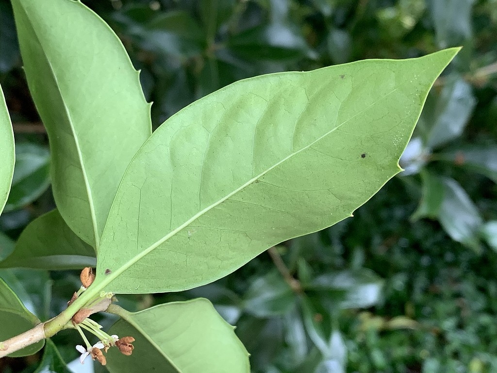 Gefunden habe ich Osmanthus x fortunei, eine Hybride aus O. fragrans und O. heterophyllus und zum Vergleich habe ich nach freundlicher Beratung durch einen der Gärtner auch noch ein Blatt von Osmanthus yunnanensis, der Yunnan-Duftblüte, mit genommen.