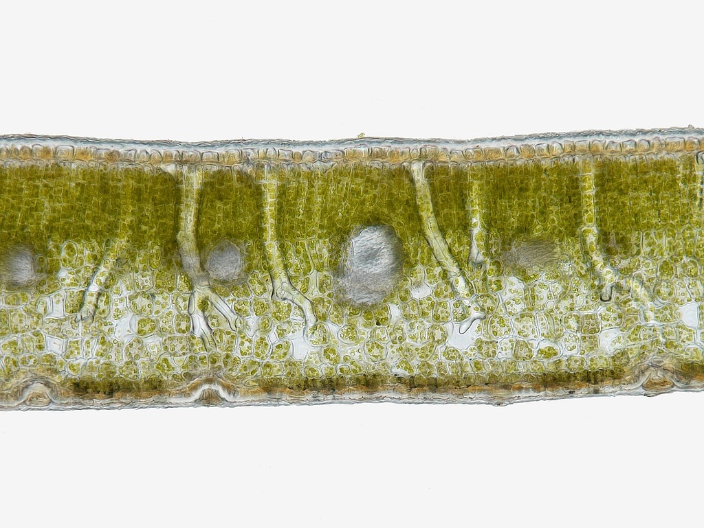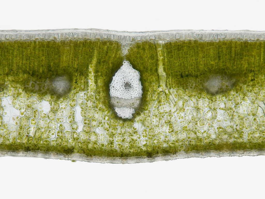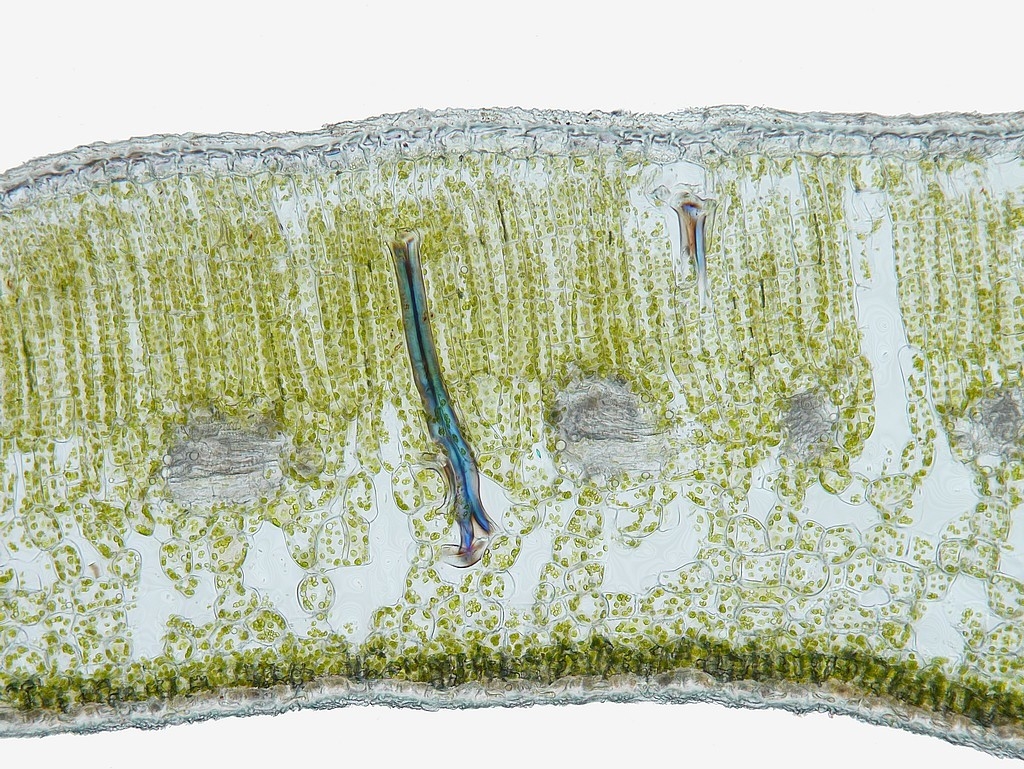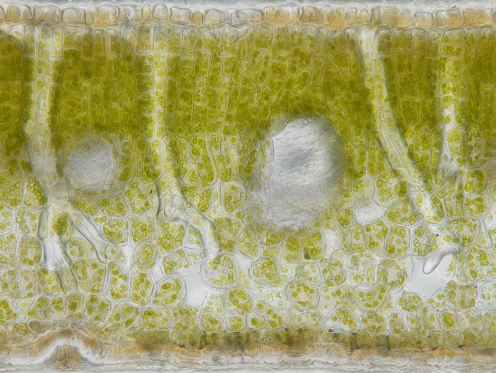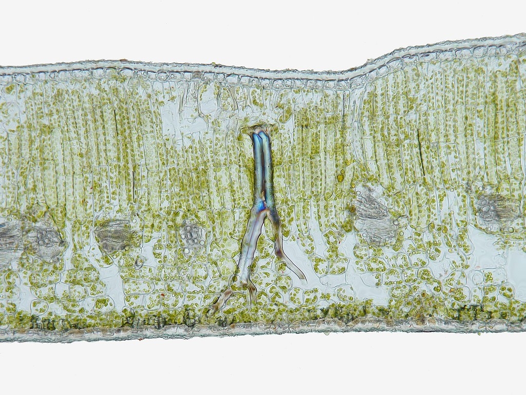 Auch hier finden wir prinzipiell den gleichen Aufbau vor, wie man es auf mikroskopischer Ebene von Arten der gleichen Gattung erwarten kann. Jedoch zeigt die Blattspreite bei einer Dicke von rund 500 µm ein deutlich ausgeprägteres Assimilationsparenchym, das mit seinen bis zu 5 Zelllagen teils mehr als die Hälfte des Gesamtdurchmessers der Spreite einnimmt.