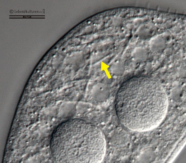 vielen Dank für das Lob und Deinen ergänzenden Beitrag mit Litonotus procerus. Meines Wissens ist Litonotus procerus noch nicht zu Amphileptus gestellt worden. Amphileptus und Litonotus werden über den Verlauf der Kineten auf der rechten Seite unterschieden. Bei Amphileptus laufen die Kineten auf der rechten Seite zu einer mittig gelegenen Naht zusammen, wogegen sie bei Litonotus sowohl auf der linken, als auch auf der rechten Seite parallel verlaufen. Deine Bilder zeigen daher meiner Ansicht nach L. procerus. Besonders wichtig ist das 7. Bild, auf dem man die geraden Extrusome erkennen kann. Die vermeindlichen Zoochlorellen sind aufgenommene Nahrung. Auf dem 4. Bild erkennt man deutlich, wie die "Zoochlorellen" in Nahrungsvakuolen liegen. Das Vieh frisst gerne S. polymorphus, Pseudoblepharisma und andere Viecher mit Zoochlorellen. Bilder 3 + 4 stellen schön ein wirklich gestrecktes Exemplar dar, wie ich es selbst nie hinbekommen habe. Wie Du in PM, Vol. 3, S. 154, Abb. 2 sehen kannst, ist hier ein s/w Bild eines gestreckten Exemplares zu sehen. Da musste mir Foissner aushelfen, weil ich selbst keines hatte.