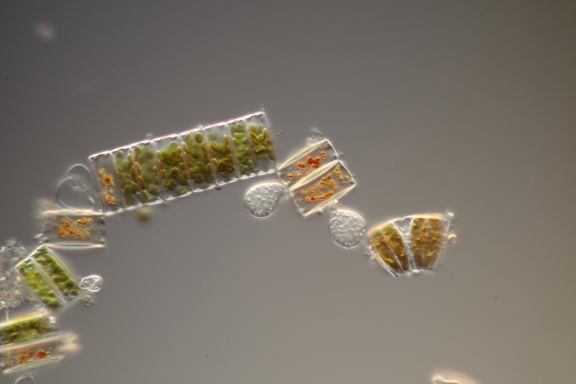 Zeitgleich mit der Vermehrung der Kieselalgen vermehren sich auch ihre Parasiten. In dieser Kolonie ist eine Zelle von einem niederen Pilz, einem Chytridiomyceten, befallen und abgetötet worden (Pfeil).