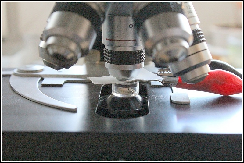 Der Versuchsaufbau ist eigentlich ganz leicht zu verstehen. Ein lichtabhängiger Widerstand wird mit seiner lichtempfindlichen Seite auf die Kondensorlinse gelegt. Das 4er Objektiv klemmt von oben her das Bauteil fest, damit es für alle Messungen keine mechanische Verschiebungen gibt. Dazwischen ein Stück Pappe, damit Kurzschlüsse vermieden werden.