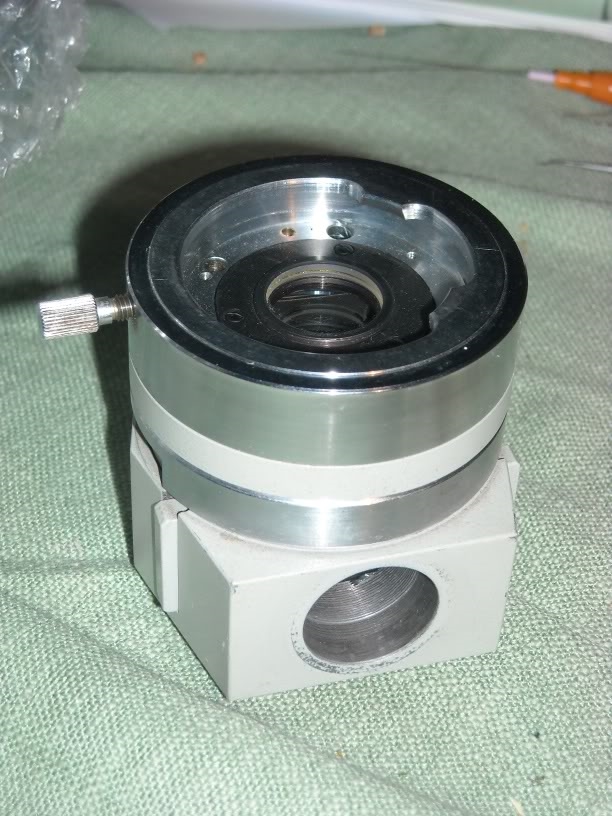 Dein Auflichtilluminator wird oberhalb des Objektivrevolvers vor dem Mono-/Binokulartubus eingesetzt. Es müßte sich ein Spiegel darin befinden, der 45° geneigt ist. Seitlich wird in das Gewinde eine Beleuchtungseinheit eingesetzt, die mit größter Wahrscheinlichkeit neben der Kondensorlinse vor der Lampe ebenfalls noch weitere optische Komponenten und Blenden enthält, um den Beleuchtungsstrahl zu formen, sprich die Leuchtfeldblende durch das Objektiv auf der Präparateebene abzubilden. Der folgende Link zeigt (unvollständige) Teile der CZJ-Epignost Beleuchtung: http://cgi.ebay.de/10542-ZEISS-Bastlersatz-Beleuchtung-EPIGNOST_W0QQitemZ280473192227. Wenn sie komplett wäre, dürfte diese besser passen. Da diese aber für ein oo-System vorgesehen ist, ist es ebenfalls sehr unwahrscheinlich, daß sie passen wird.
