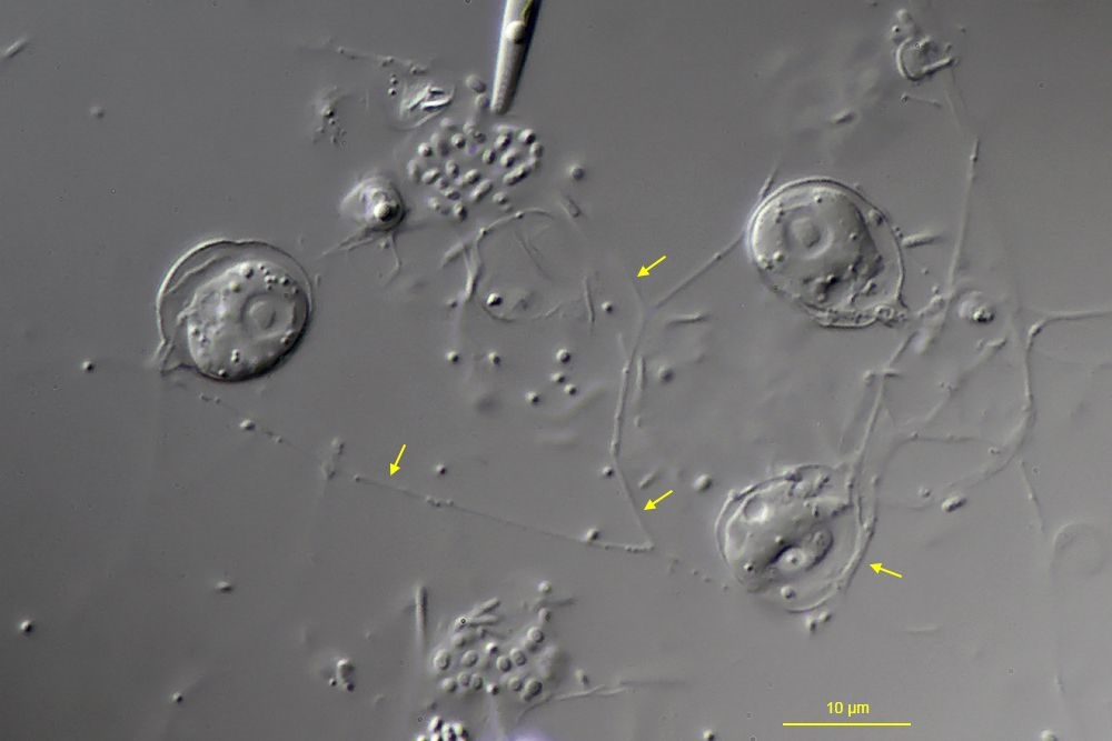 Nach einigen Tagen waren die Deckgläser reif zur Untersuchung. Schon auf dem ersten Deckglas fielen mir kleine, nur gut 10 µm große Zellen in lockeren Verbünden auf, die in einem zarten Gehäuse leben und über ein Netz feiner Granulopodien miteinander in Kontakt stehen. Es war schnell klar, dass dies granuloreticulose Schalenamöben, nämlich Microgromiiden der Gattung Microgromia, vermutlich M. socialis, sein mussten. Hier zwei Bilder eines solchen kolonialen Verbunds, einmal mit dem Trockenobjektiv 40:1 und dann mit der Ölimmersion 100:1 (einige Granulopodien mit Pfeilen markiert):