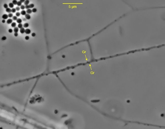 Untersucht man die Granulopodien genauer, stellt man fest, dass sie ein sehr dynamisches System darstellen. Wie auf zarten Gleisen bewegen sich Granulen (Gr, Größe im Submikrometerbereich) mal gleitend, dann wieder stockend entlang der Granulopodien – und das in entgegengesetzten Richtungen. Im folgenden Bild – einem stark vergrößerten Ausschnitt aus einer Phasenkontrastaufnahme, die dunklen Strukturen links oben stellen Bakterien dar – habe ich zwei Granulen an einem Granulopodium markiert. Diese stehen sich fast gegenüber und bewegten sich zum Zeitpunkt der Aufnahme in entgegengesetzter Richtung, ohne zu kollidieren: