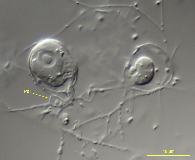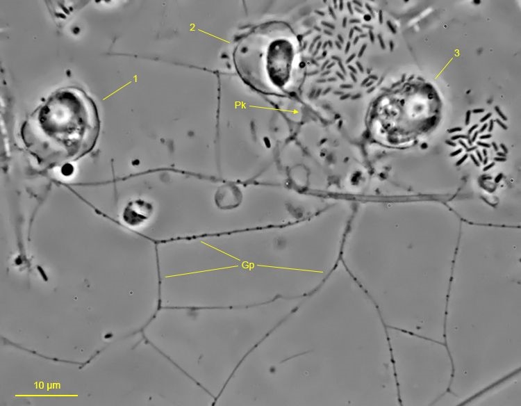 Der Phasenkontrast zeigt die Granulopodien (Gp) besonders schön: Hierbei handelt es sich um feine Cytoplasmafäden, die mit winzigen Granulen besetzt sind. In der Nähe der Zellköper – in der folgenden Abbildung sind drei Zellen (1-3) dargestellt – treten gelegentlich Plasmaknoten (Pk) auf: