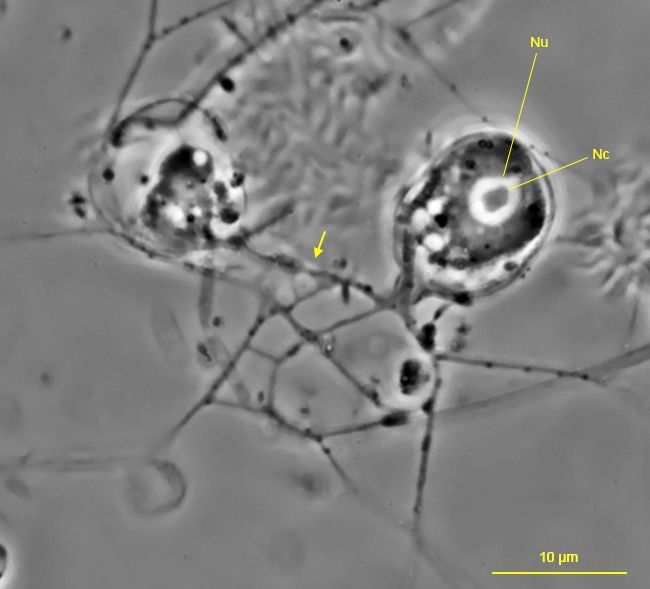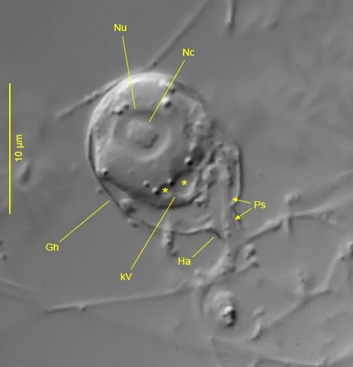 An den Zellen selbst kann man trotz ihrer geringen Größe (um 10 µm) bei möglichst hoher Beleuchtungs- und Objektivapertur zahlreiche Details erkennen. Der Zellkörper ist umgeben von einem zarten Gehäuse (Gh) mit kurzem Hals (Ha). Deutlich tritt der Kern (Nu) mit zentralem Nukleolus (Nc) hervor. Zwischen Kern und Plasmastiel (Ps) liegt die kontraktile Vakuole (kV; Lumen der kV und der Zuführungsvakuole mit * markiert). Der Plasmastiel verlässt das Gehäuse durch den Hals und verästelt sich außerhalb des Gehäuses in das Netzwerk der Granulopodien: