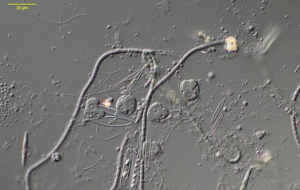um über die freien Ostertage Material fürs Mikroskopieren zu haben, war ich am Karfreitag am Main in der Nähe von Würzburg bei Randersacker unterwegs. Auf einem kleinen Tümpel in der Mainaue trieben hellbraune, von Blasen durchsetzte Flocken. Es handelte sich hierbei um die im Frühling häufigen ,,Auftriebe", die vor allem aus Cyanobakterien, Kieselalgen und fädigen Grünalgen bestehen. Durch die starke Photosynthesetätigkeit im Frühjahr wird in diesen komplexen Aggregaten verschiedenster Organismen reichlich Sauerstoff produziert, der dafür sorgt, dass sich ganze Organismenmatten wie ein Floß vom Gewässergrund heben und von der Oberfläche leicht abzusammeln sind. Für den Mikroskopiker kann solch eine Probe Auftrieb mehr als wochenendfüllend sind.