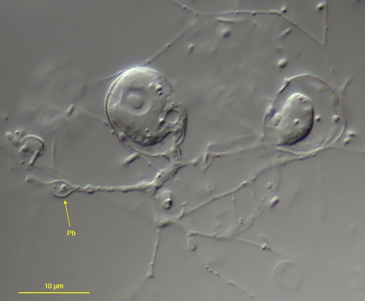 Zweifelsohne dienen die Granulopodien dem Beutefang. Im Detail habe ich dies nicht untersucht, kann aber zumindest eine indizienhafte Beobachtung hierzu beisteuern. Innerhalb einer blasenförmigen Struktur, die ich in meinen Aufzeichnungen ,,Phagocytoseblase" (Pb) genannt habe, fand ich Partikel von wenigen µm Größe eingeschlossen. Ich vermute, dass es sich um Bakterien als Nahrung handelt. Die Phagocytoseblase wanderte entlang eines (sich verkürzenden?) Granulopodiums in Richtung Gehäusehals. Die beiden folgenden Aufnahmen zeigen diesen Vorgang; zwischen den Aufnahmen lagen min 2:40. Den anschließend zu erwartenden Durchtritt der Pb in das Gehäuse konnte ich nicht dokumentieren: