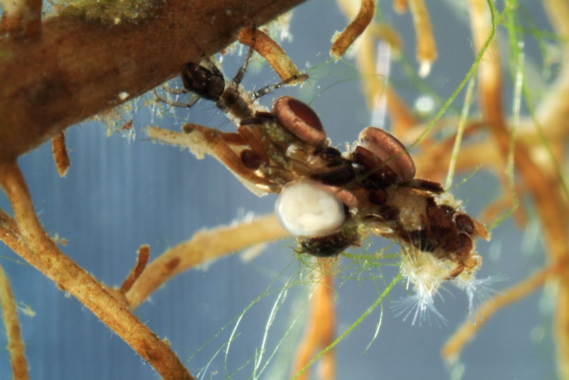 das ist ja faszinierend: eine Köcherfliegen?larve die Flottoblasten in ihre Röhre eingebaut hat. Leben die alle bei Dir in einem Aquarium?