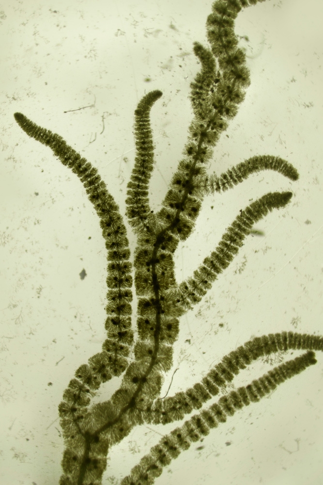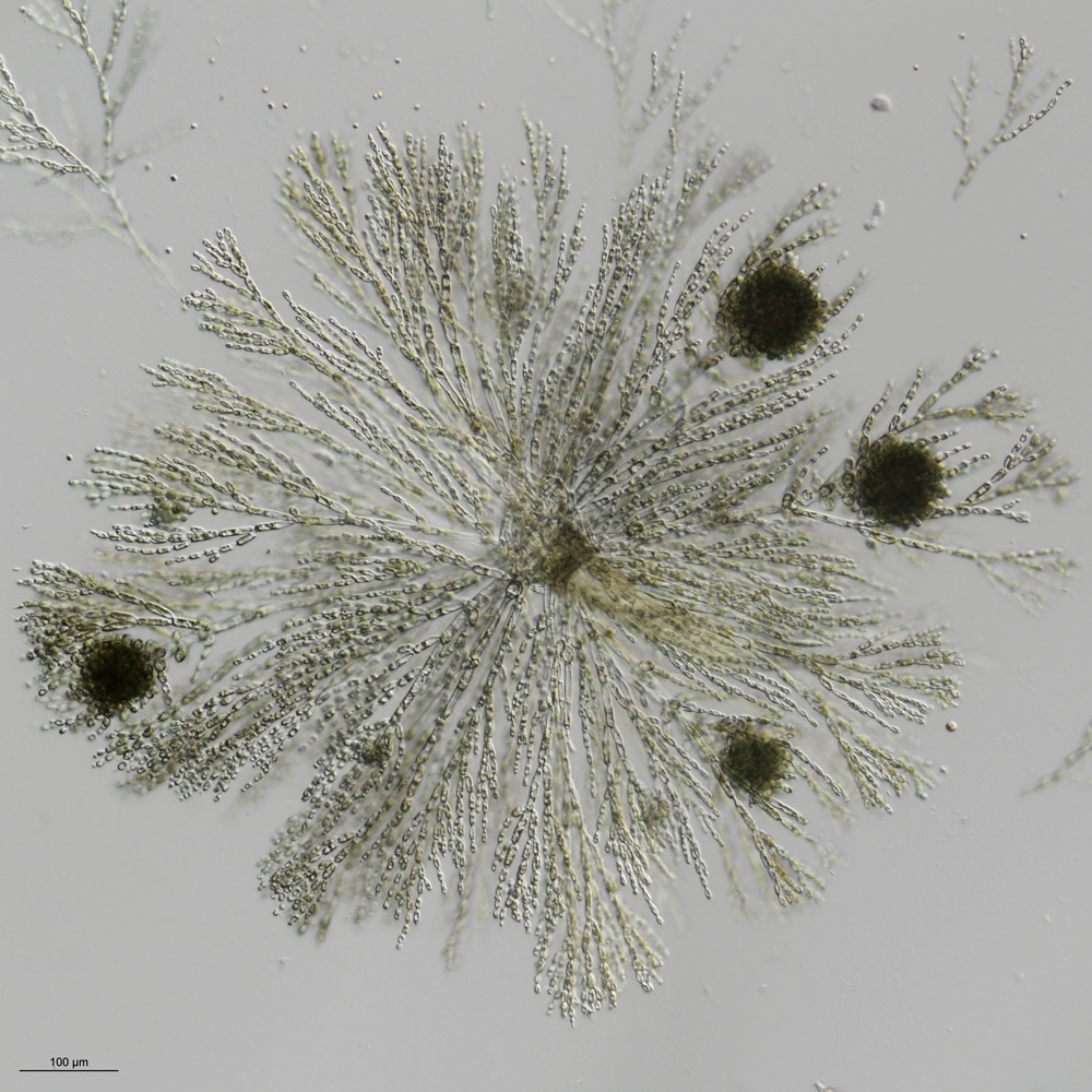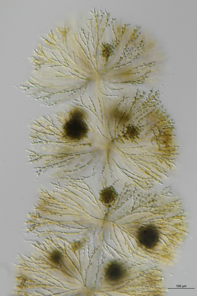 Unter dem Stereomikroskop ist der komplexe Aufbau dieser Pflänzchen gut zu erkennen. Sie bestehen aus verzweigten zentralen Fadenzellen, an denen in regelmäßigen Abständen wirtelartig Büschel von verzweigten Seitenästen (Kurztriebe) sitzen. Die Fäden sind in eine gemeinsame Gallerte eingebettet und deshalb schleimig.