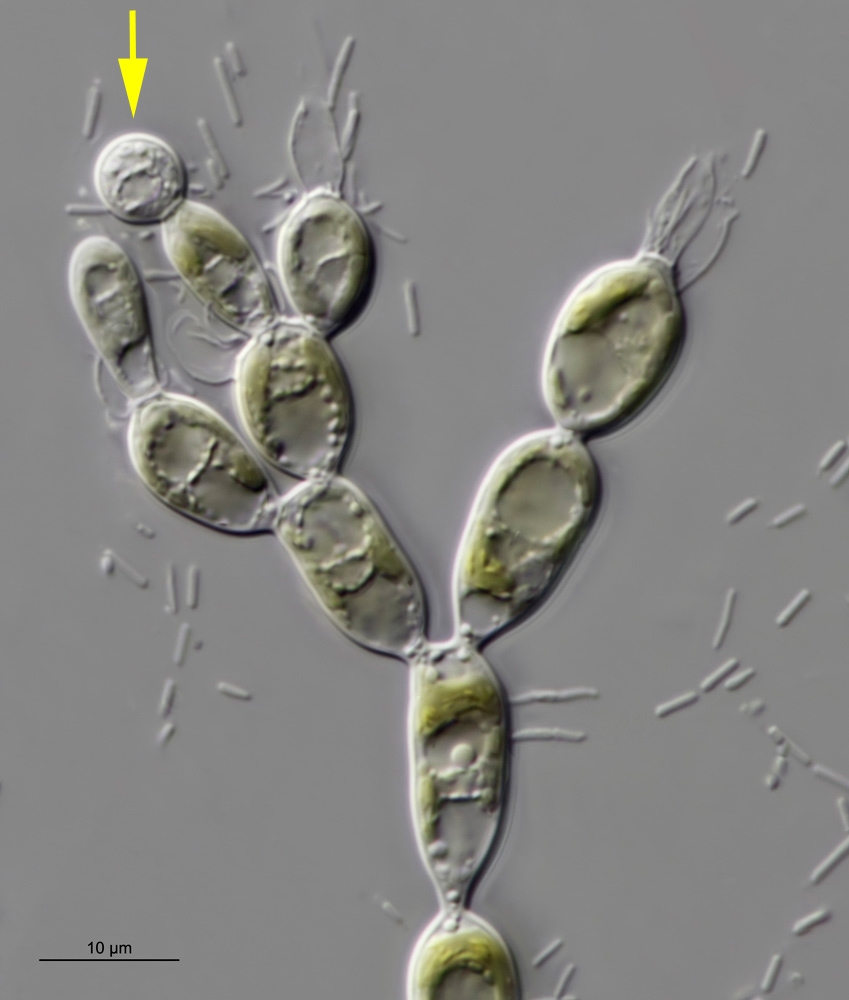 Ebenfalls an den Spitzen von Kurztrieben sitzen die weiblichen Geschlechtszellen (Oogonien; Pfeil). Die vegetativen Zellen und die weibliche Geschlechtszelle bilden zusammen den weiblichen Gametophyten.
