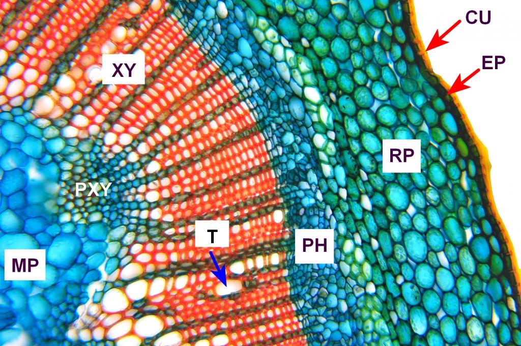 MP = Markparenchym, PXY =   Protoxylem  , XY = Xylem, T = Trachee im Xylem, PH = Phloem, RP = Rindenparenchym, CU = Cuticula, EP = Epidrrmis