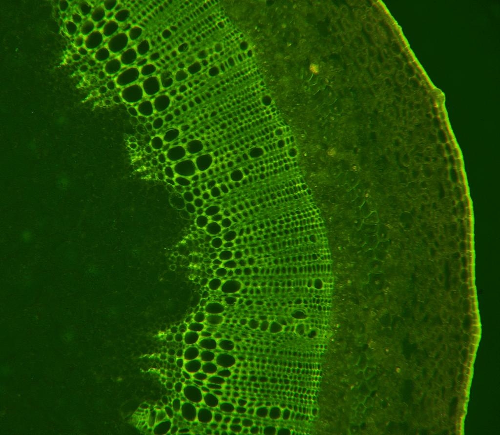 Zellwände blaugrün bis grün, verholzte Zellwände leuchtend rot, Zellwände der äußeren Hypodermis orangerot, Cuticula gelb, Zellwände der innenliegenden Hypodermis tiefrot.