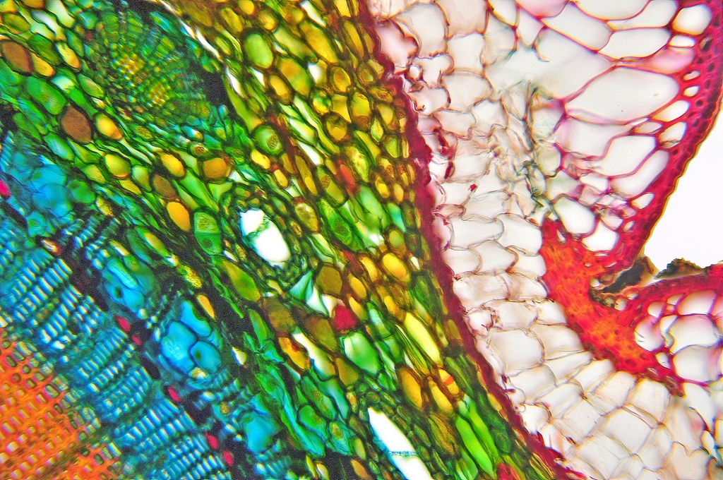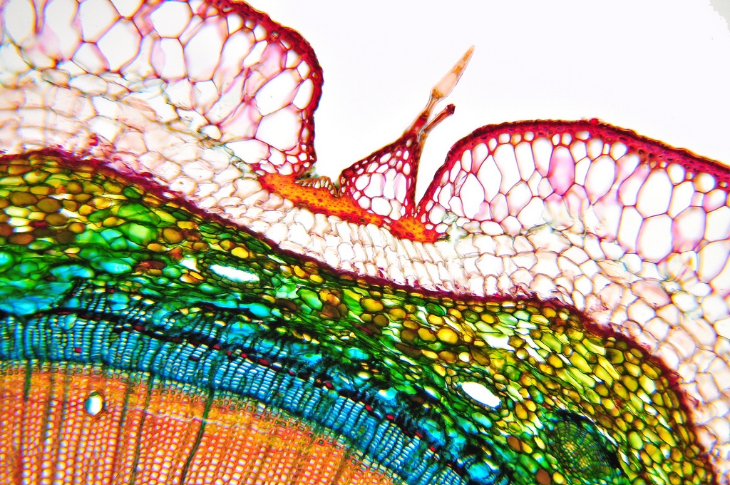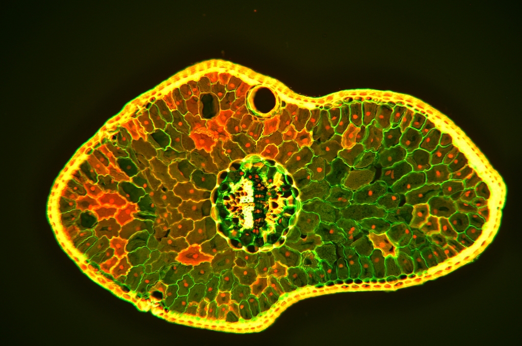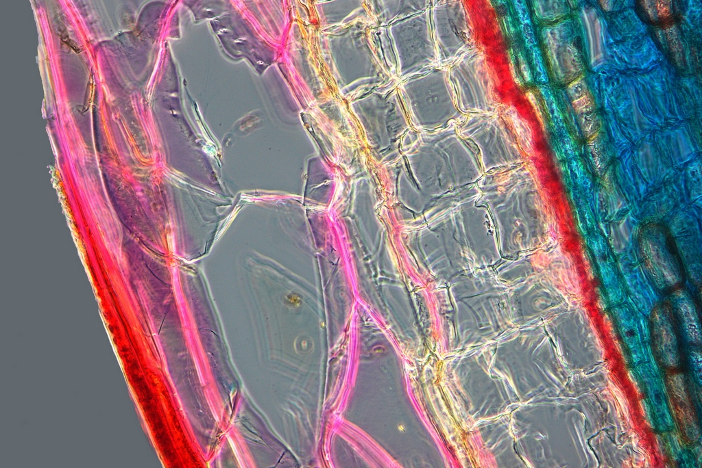 Zellwände blaugrün bis grün, verholzte Zellwände leuchtend rot, Zellwände der äußeren Hypodermis orangerot, Cuticula gelb, Zellwände der innenliegenden Hypodermis tiefrot.