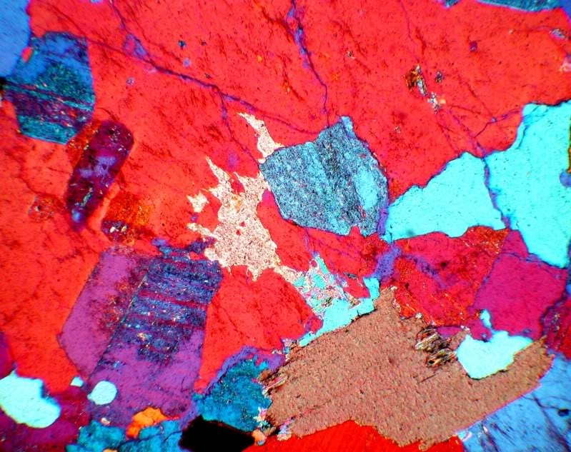 Da Dünnschliffe derzeit so ein heißes Thema sind, zeige ich einmal aus rein ästhetischen Gründen diesen schönen Schliff, ohne davon die Spur einer Ahnung zu haben. Aber ich verstehe durchaus, dass das ein sehr interessantes und fesselndes - auf jeden Fall wohl oft farbenforhes- Gebiet sein kann. Und weiss erst jetzt, nachdem ich mehr über die mühsame Herstellung solcher Schliffe gelesen habe, dieses Geschenk auch zu würdigen.