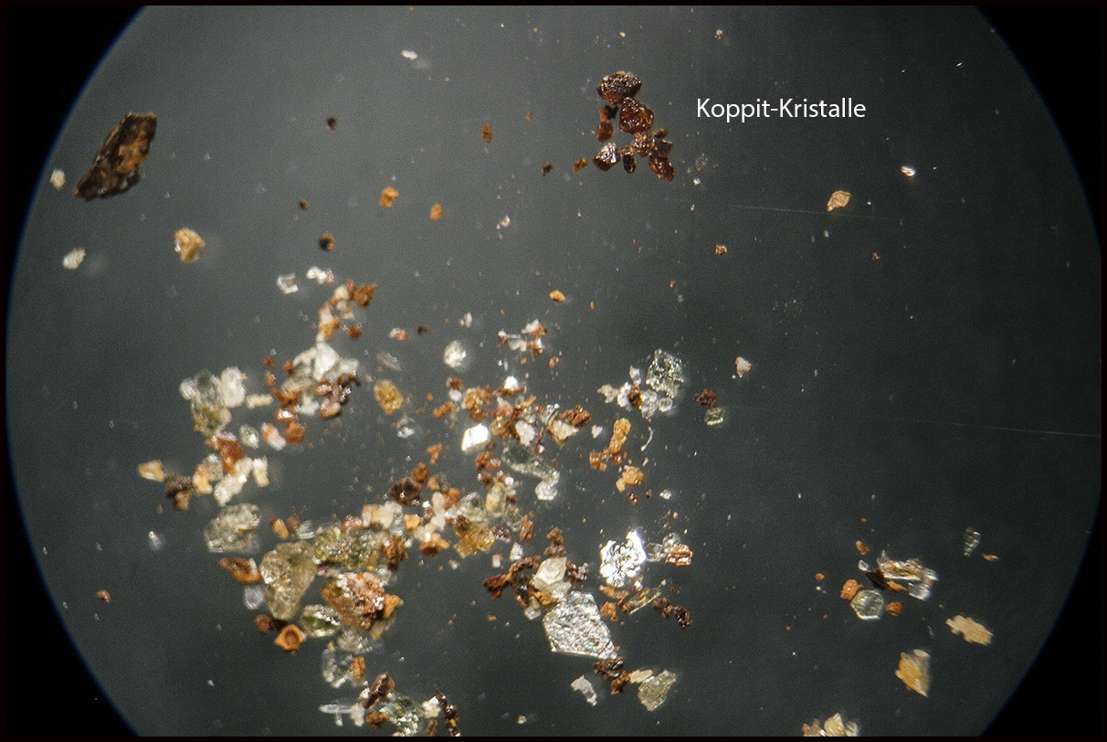Am oberen Bildrand sieht man einige der mit einer Plastiknadel herausgeschobenen Koppit-Kristalle.