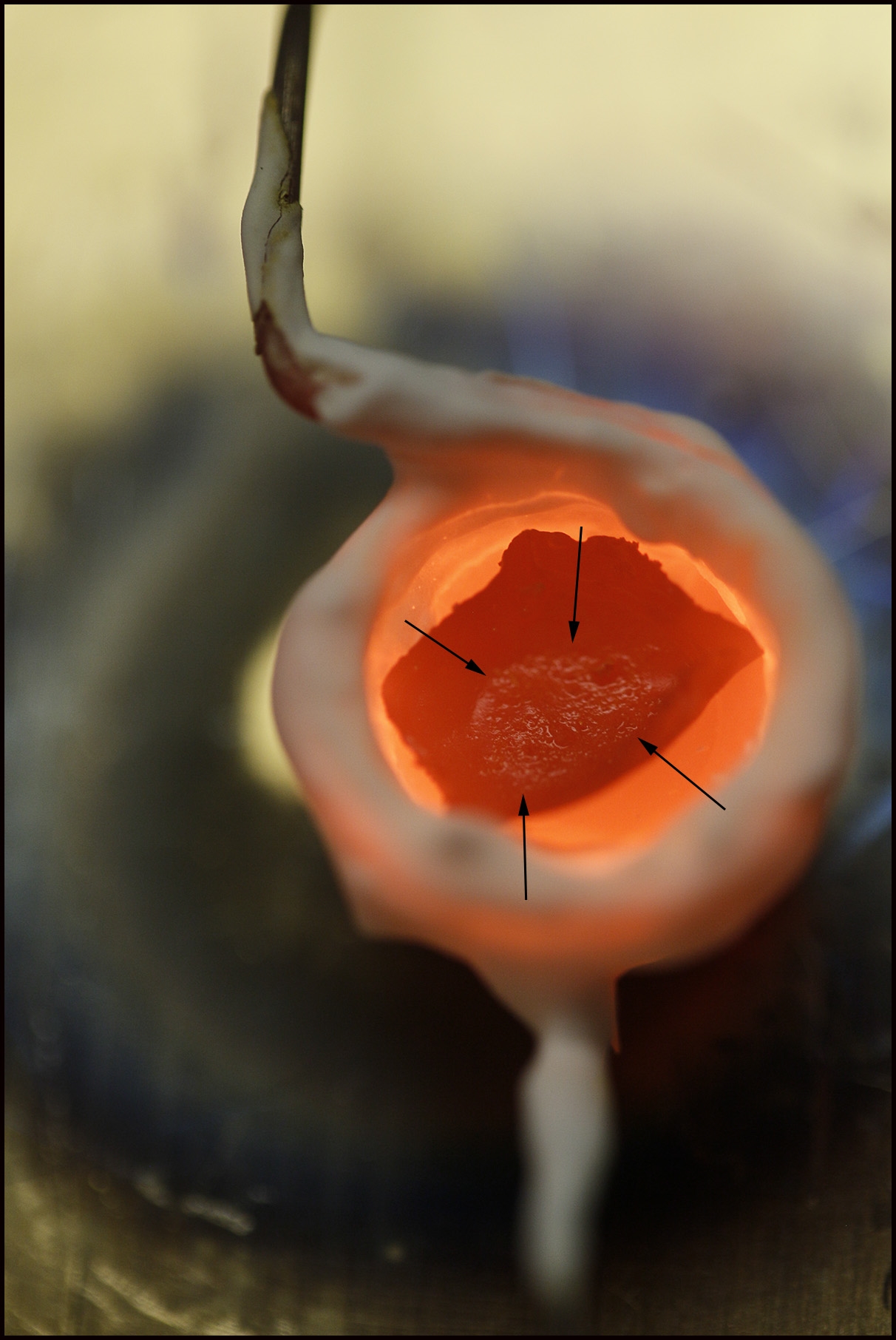 Der "Reaktor" nach Erreichen der Schmelztempertur des Gemisches. Pfeile: Rand der Schmelze auf dem Platin-Tiegel