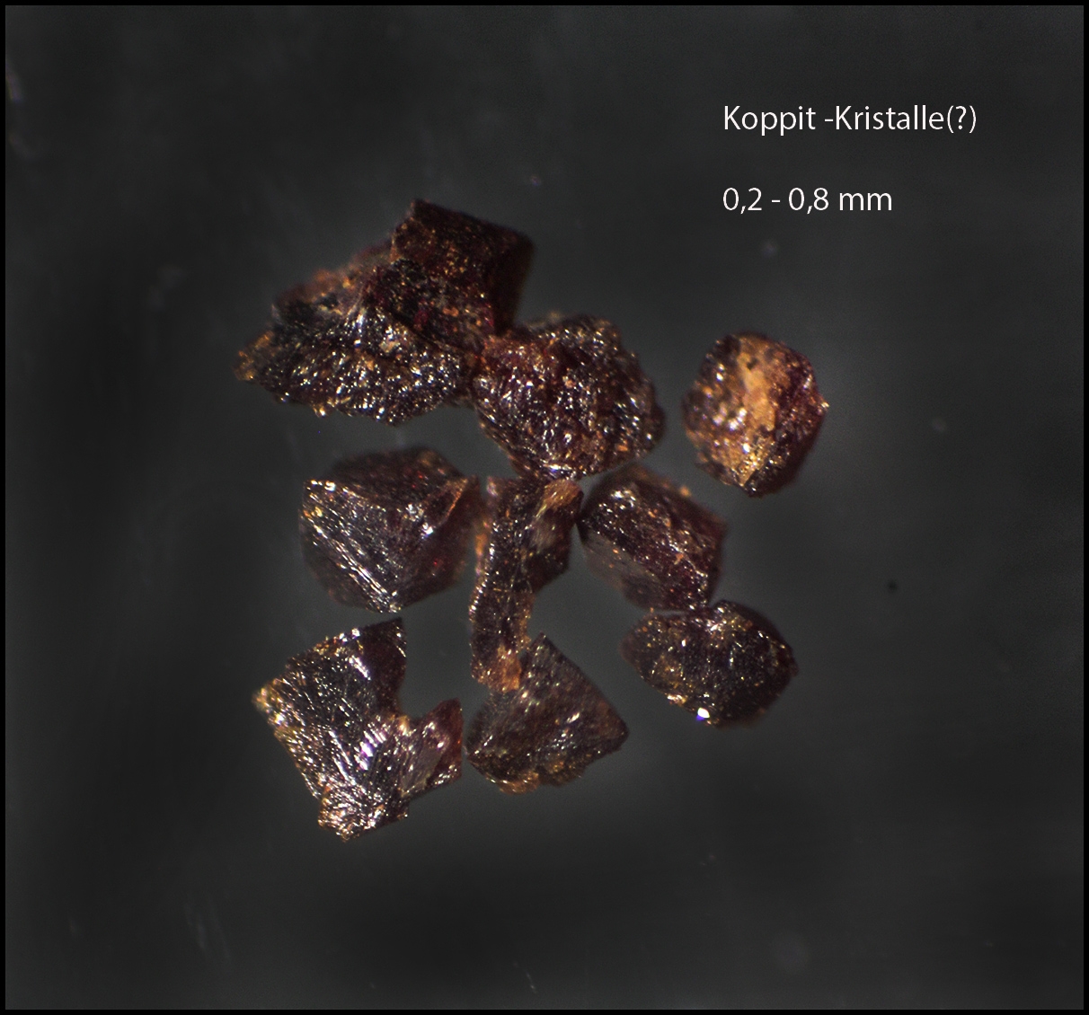 Das war eine Herausforderung zum einen durch die letztlich geringe Menge des (m.E.) tatsächlich enthaltenen Koppits in der Probe; zum anderen wegen des grundsätzlich sehr problematischen Nachweises des Niob im Koppit.