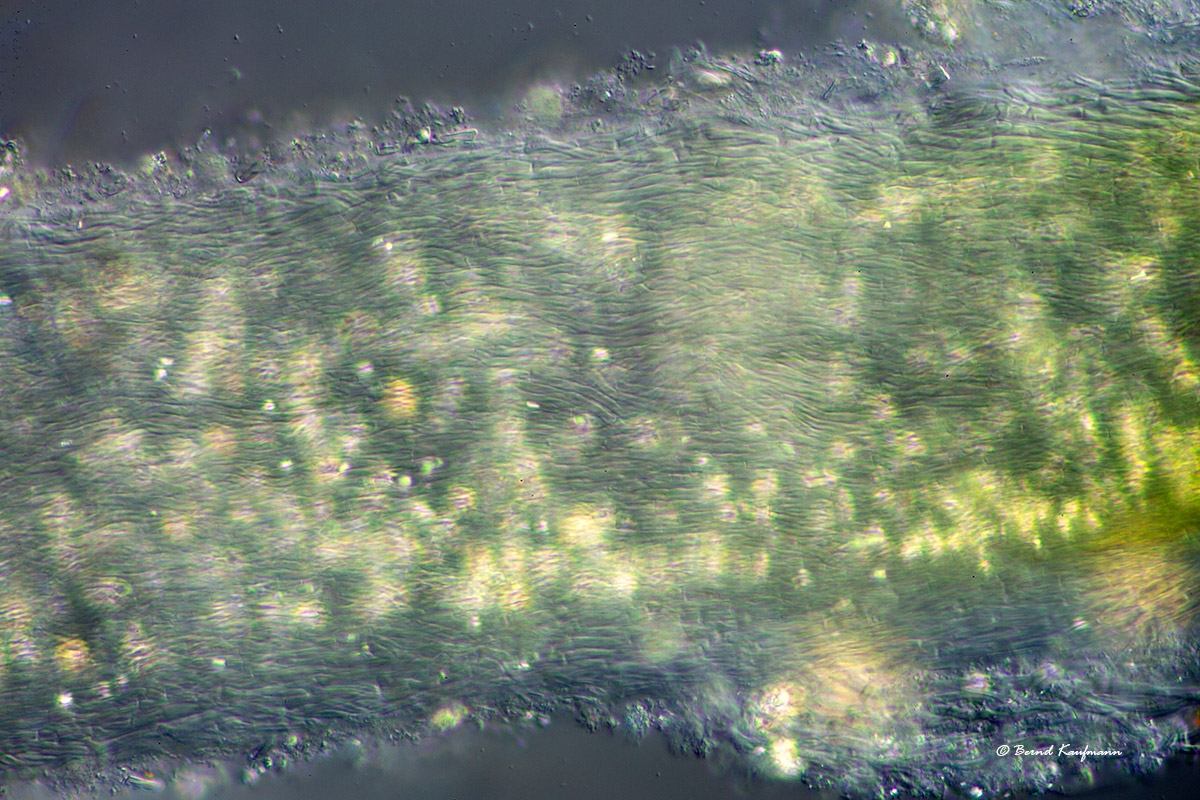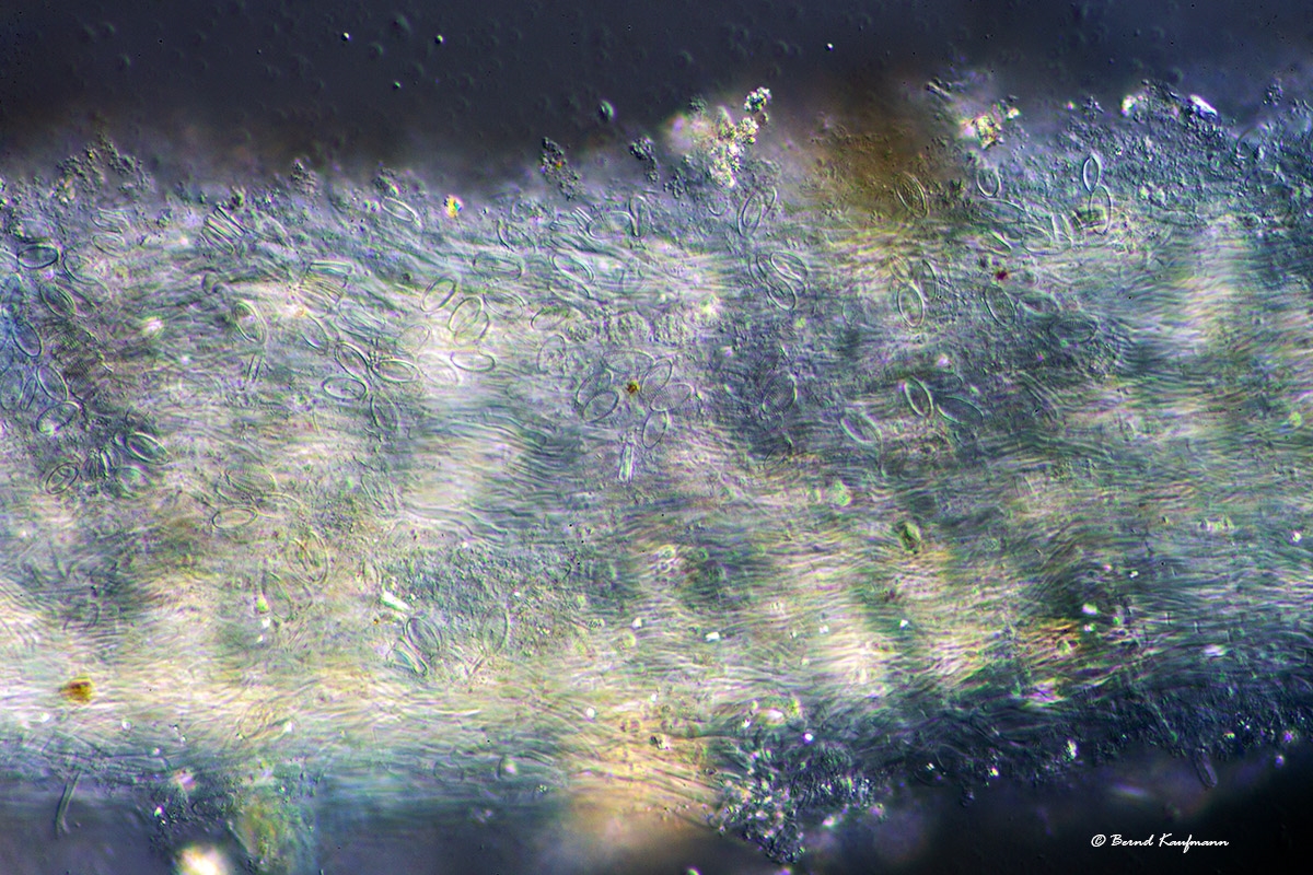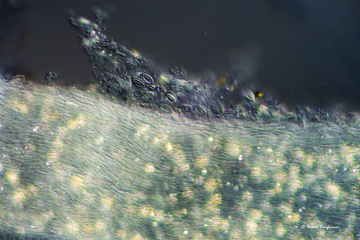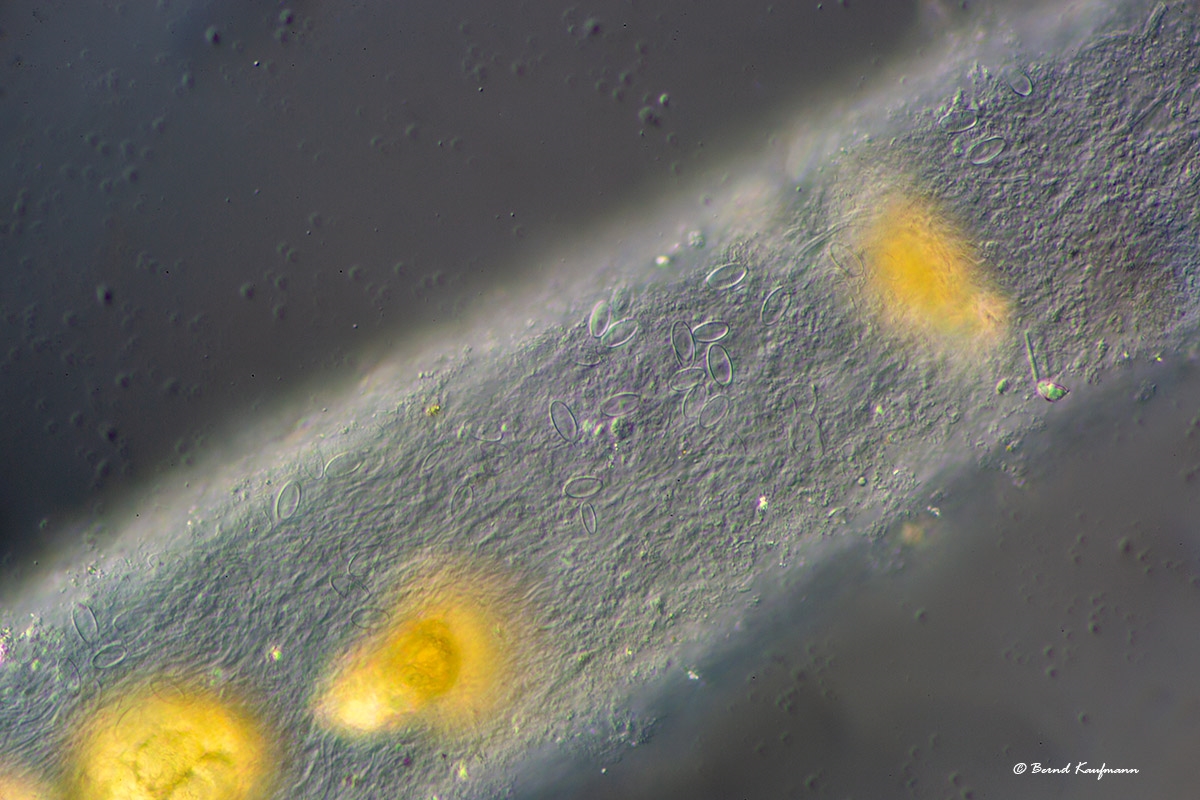Zuerst dachte ich tatsächlich, die ovalen Teile könnten Sporen sein, aber dann fiel mir ein, dass das alles unter Wasser stattfindet und es dann viel wahrscheinlicher ist, dass es sich um die leeren Frusteln aufsitzender Kieselalgen handeln dürfte.