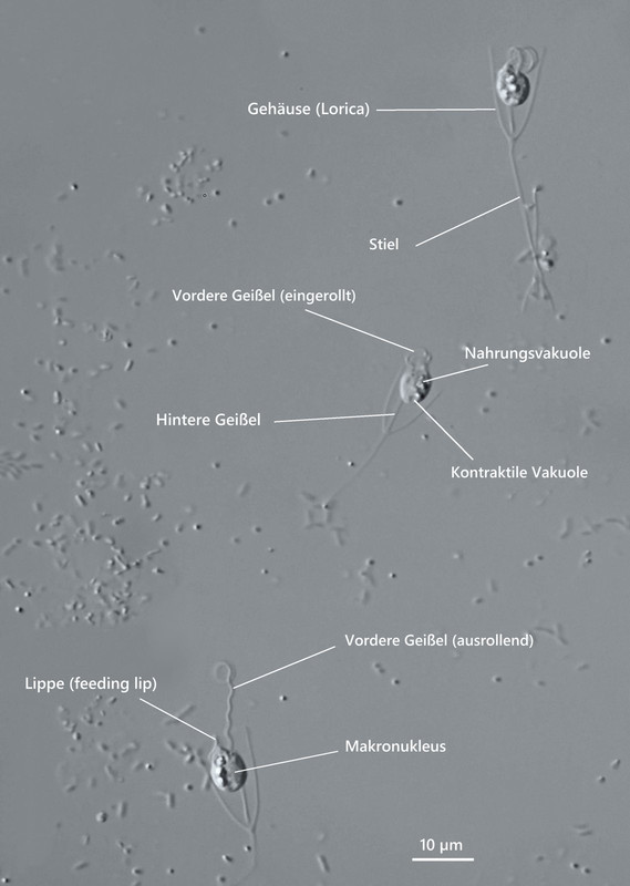 Die Zellkörper meiner Flagellaten waren ca. 7-8 µm groß. Sie sitzen in einem spitzkelchartigen Gehäuse und halten sich ungewöhnlicherweise mit der hinteren Geißel am Boden der Lorica fest. Diese Geißel kann den Zellkörper im Gehäuse leicht hin- und herbewegen. Die Lorica selbst ist mit einem starren Stiel am Substrat festgeheftet.