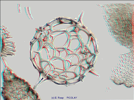 hier noch einmal Ergebnisse aus einem Bilderstapel von Eberhard Raap: Eine Radiolarie in 3D (für die Rot-Cyan-Anaglyphenbrille) von vorne und hinten: