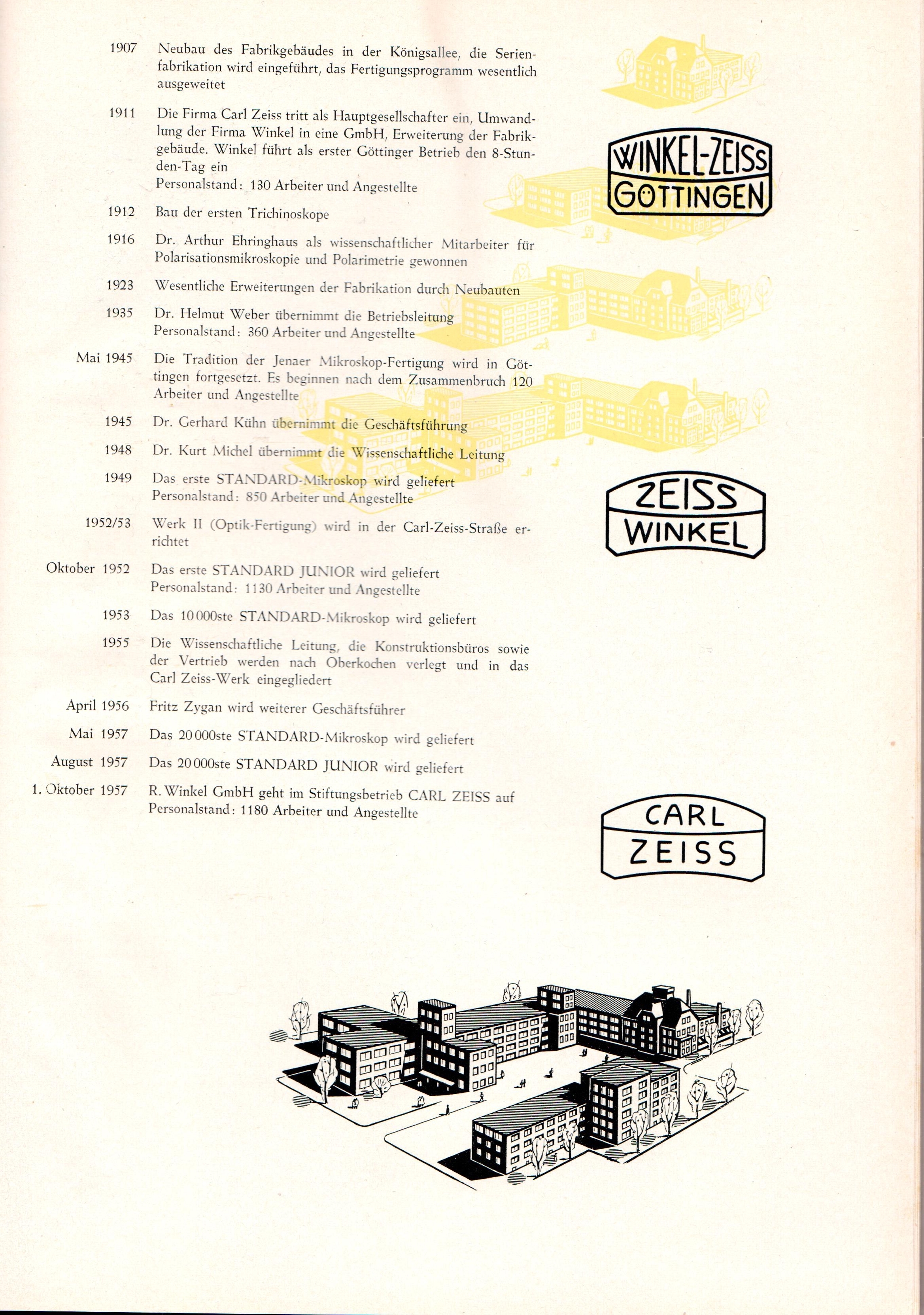 Die Firma R. WINKEL war bereits 1911 in den vollständigen Besitz der Firma Carl Zeiss, Jena übergegangen. Nach dem Krieg wurde in Göttingen von (1949) 1953 bis 1957, also bis zur Eingliederung des Göttinger Betriebes in die 1949 in Heidenheim/ Brenz gegründete ZEISS- Stiftung, eine neu entworfene ZEISS- WINKEL- Linse verwendet. Die Eingliederung der Fa. R. WINKEL GmbH, Göttingen in die Stiftung geschah zum 100. Geburtstag der Fa. R. Winkel am 01. Oktober 1957. Es gab da in Göttingen eine sehr große Feier, über die von den älteren Kollegen noch lange gesprochen wurde ... Die ZEISS- WINKEL- Logos wurden aber ab 01. Oktober 1957 vom neuen Stiftungsbetrieb konsequent aussortiert und verschrottet.