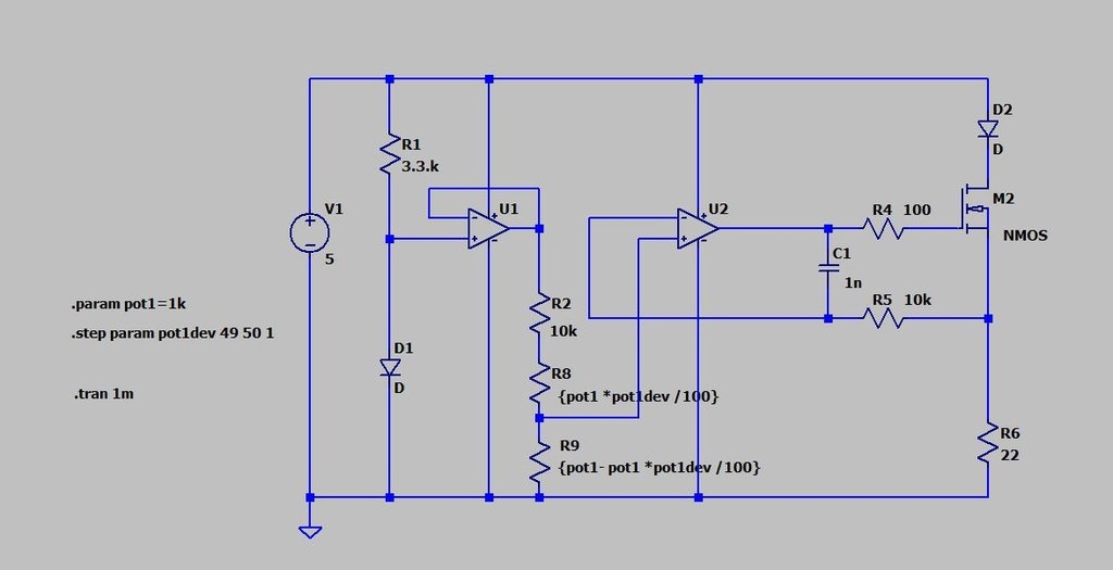 Das liegt noch am NFET, der will nicht durchschalten. Ich muss mir mal den IRF530 aus einer Library holen und ihn einbinden.