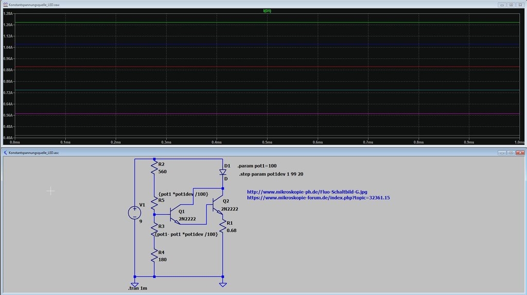 Die kleinen KSQ-Module sind insofern Konstantstromquellen, als dass sie eben keine Spannungsquellen sind, wo sich der Strom mit der Temperatur der LED ändern würde, aber sie liefern keinen zeitlich konstanten Strom. Man sieht das bei jeder LED-Leuchte. Entsprechende Kondensatoren zur Glättung wären groß oder man bräuchte eine viel höhere Schaltfrequenz, was Störungen macht, oder eben wie bei mir einen Transistor, der im linearen Betrieb Verlustleistung produziert. Aber man sieht das nur bom Fotografieren, wenn die Belichtungszeit entsprechend kurz wird, was am Mikroskop sehr leicht der Fall ist.