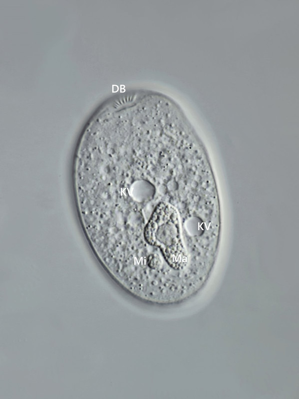 Eine abschließende Fokussierung auf die Dorsalseite zeigt nochmals die frontale Dorsalbürste, den Mikronukleus (Mi) sowie die beiden schräg zum Zellkern liegenden Kontraktilen Vakuolen (KV).