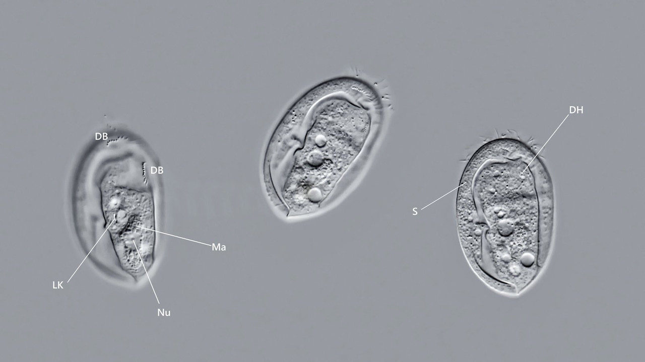 Die dorsale Oberseite vermittelt einen völlig anderen Eindruck. Sie ist weitgehend unbewimpert und besitzt einen Höcker (DH), der von einem Saum (S) umgeben ist. Der unregelmäßig geformte Makronukleus (Ma) mit dem zentralen Nucleolus (Nu) tritt deutlich hervor. Neben dem Zellkern befindet sich ein kleiner hantelförmiger lichtbrechender Körper (LK), dessen Funktion bislang ungeklärt ist. Arttypisch sind die Dorsalbürsten (DB). Bei G. membranaceus handelt es sich im Frontalbereich um zwei Gruppen von bis zu 10 Cilien.