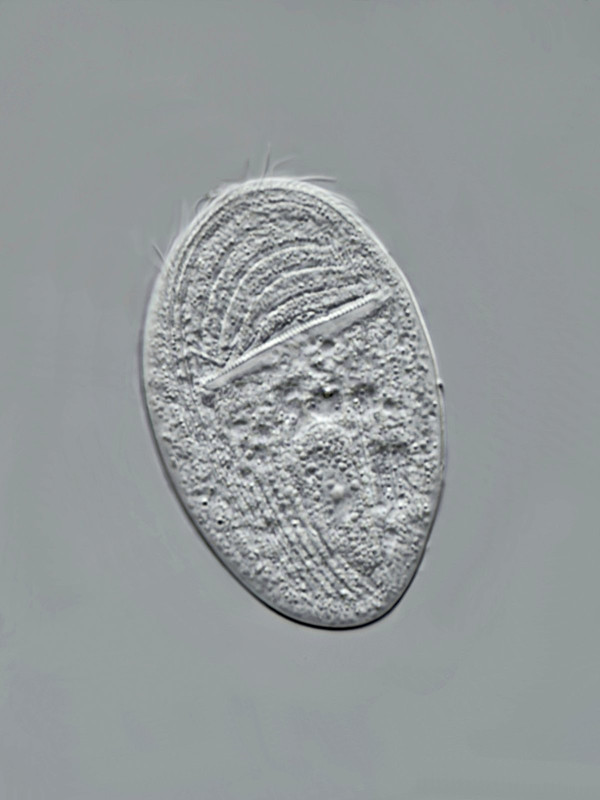 Genauere Beobachtungen im DIK 100 (nachstehende Aufnahmen) erwiesen sich trotzdem als schwierig, weil sich meine ca. 6-8 Exemplare sehr unruhig auf der Deckglasunterseite bewegten und durch ihre ausgeprägte flach-ovale Form kaum still legen sprich einquetschen ließen. Auch die Überführung in einen Reinwassertropfen mit Hilfe einer Mikropipette wollte nicht gelingen, da die Tierchen mit ihrer bewimperten Ventralseite förmlich an der Oberfläche "klebten".