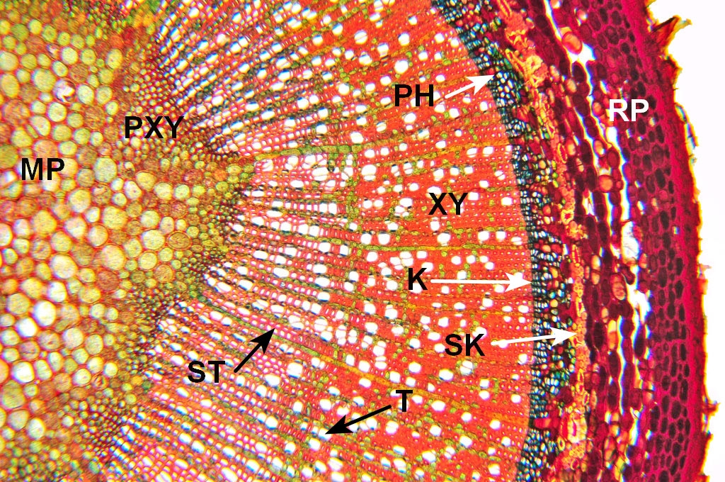 MP = Markparenchym, PXY = Primäres Xylem, ST = Strahl, T = Trachee, PH = Phloem, RP = Rindenparenchym, K = Kambium, SK = Sklerenchym, XY = Xylem