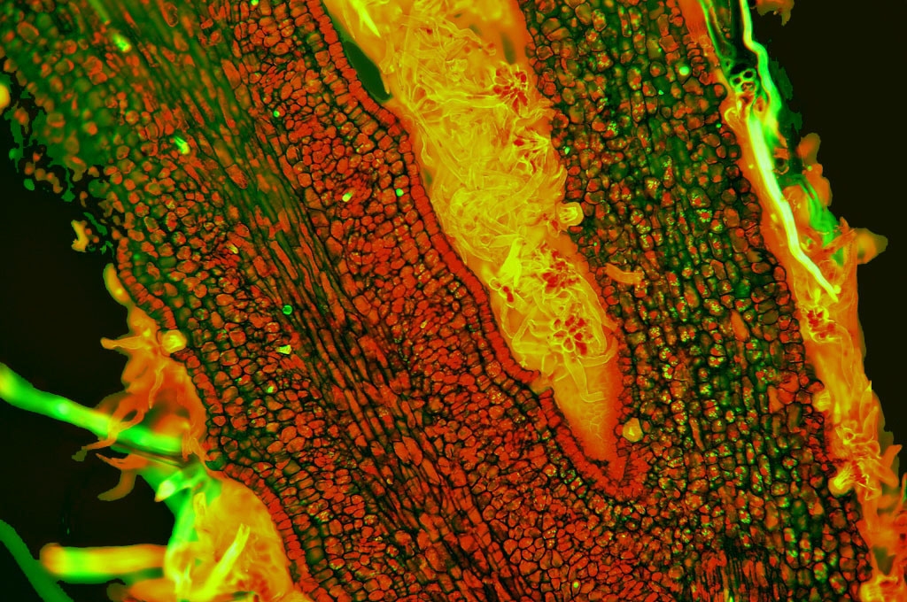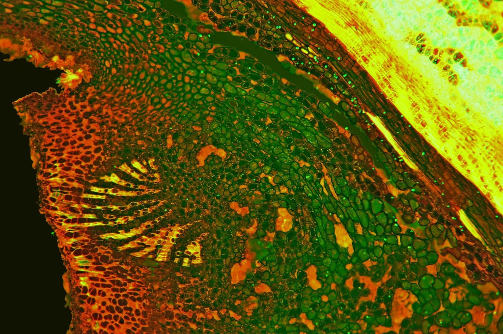 Zellwände blaugrün bis grün, verholzte Zellwände leuchtend rot, Zellwände der äußeren Hypodermis orangerot, Cuticula gelb, Zellwände der innenliegenden Hypodermis tiefrot.