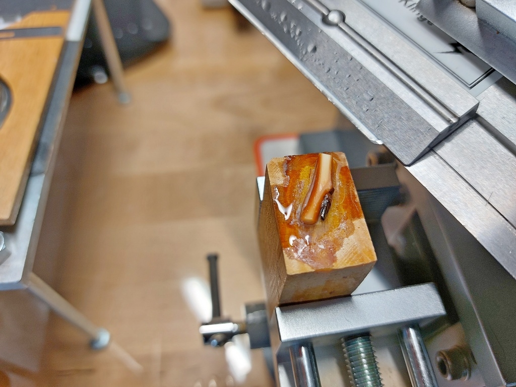 23 Aufgeklebte Schnittprobe auf einen kleinen Holzklotz, Gelbbunter Ranunkelstrauch (Kerria japonica)