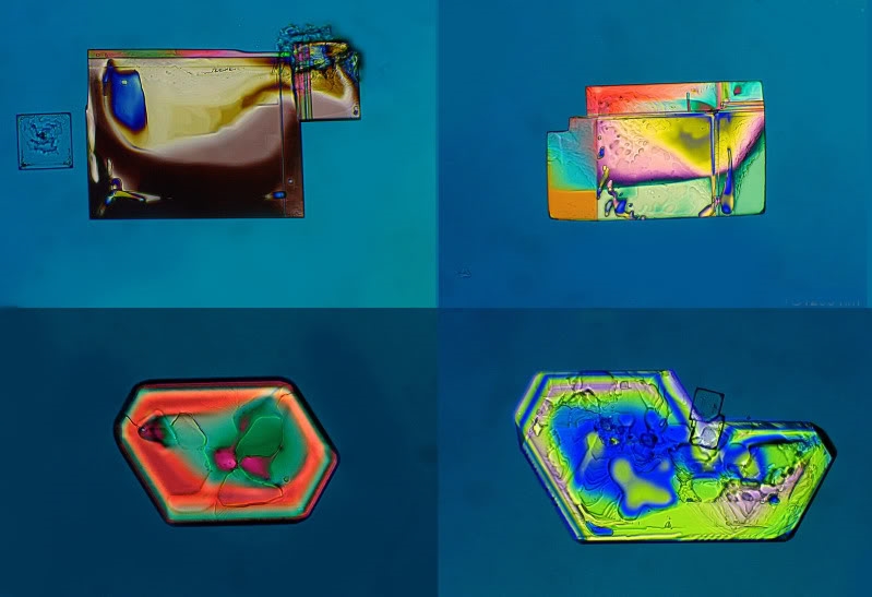 nach einer Wasserlösung von Salz vom Toten Meer bleiben bei Raumtemperatur nichtverdunstende "Pfützen" auf dem Objektträger, in denen oft schöne Einzelkristalle wachsen. Die beiden Bilder zeigen eine kleine Auswahl. In der oberen Reihe des ersten Bildes erscheint dasselbe Exemplar in zwei verschiedenen Polarisationsstellungen. Man kann so die Farben stark beeinflussen. Leider weiß ich nicht, welche Formen zu welchen der verschiedenen Salze gehören.