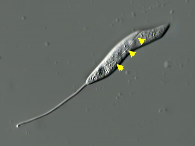 1. Anisonema sp. ist ein ebenfalls heterotropher Flagellat mit zwei ungleich langen Geißeln. Ob Anisonema ein Organell zur Nahrungsaufnahme hat, darüber gehen die Meinungen auseinander. Wegen der  sehr langen Schleppgeißel könnte es sich bei dem hier gezeigten  um  A. obliquum handeln: