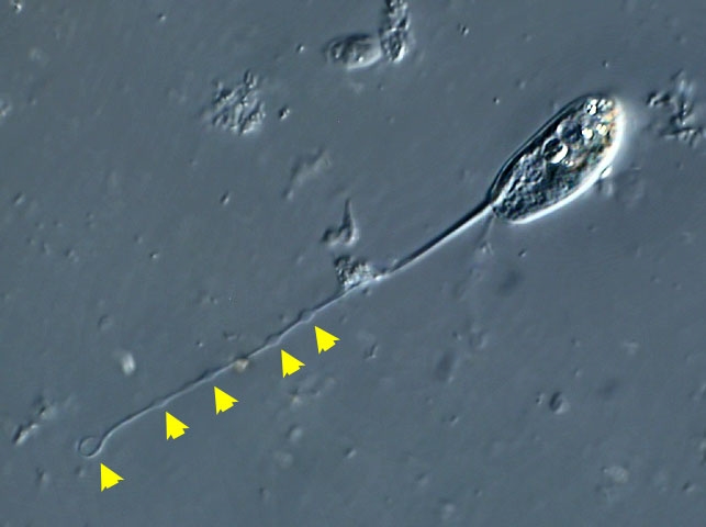 Nach einiger Zeit unter dem Deckglas treten seltsame Schleifenbildungen / Auffaserungen der Geißel auf (gelbe Pfeilspitzen):