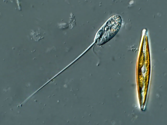 neulich hatte ich hier schon einmal ein paar Bilder zu  farblosen Flagellaten gezeigt, die ich salopp als Geißel"tierchen" bezeichnet habe. Hier nun zwei weitere Vetreter: