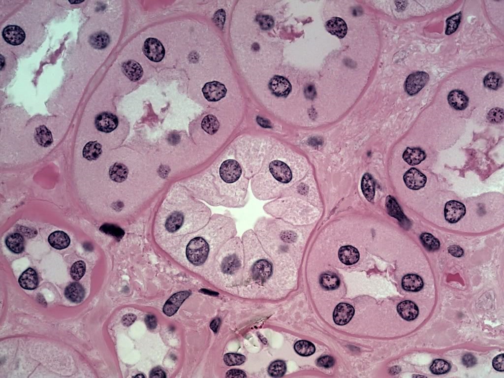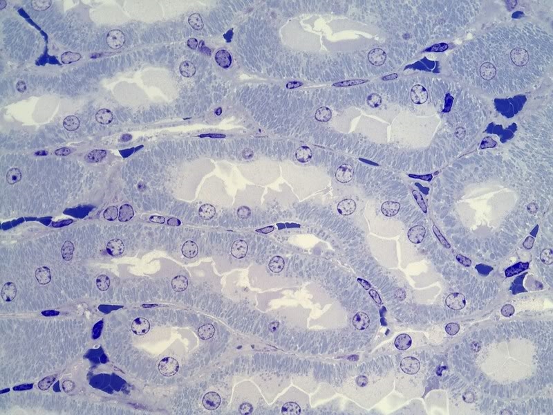 Im Bild Nr 2 in meinem ersten Post erkennt man rechts von der Mitte eine Nierentubuluszelle und daneben das angrenzende Bindegewebe.
