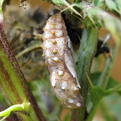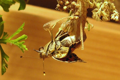 der blitzblaue Kandidat hat 100 Punkte, denn es handelt sich tatsächlich um die Exuvie von Vanessa cardui (Distelfalter):