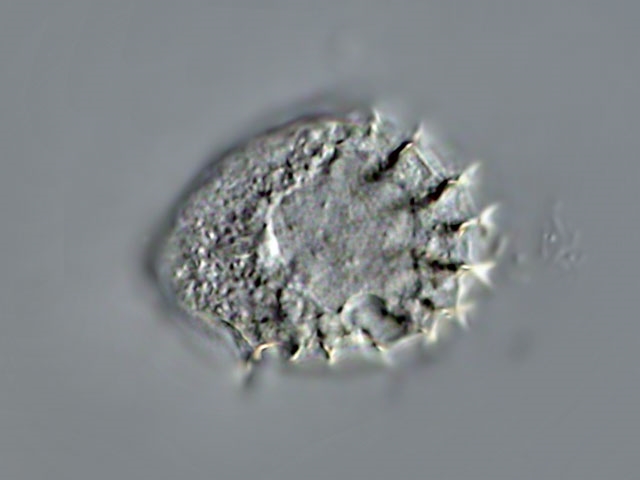 Ich halte den Ciliaten für einen Cyrtophoriden. Nach Rücksprache mit Martin Kreutz hat sich Chilodonella gouraudi ergeben. Nach KAHL (S.239) ist die Funktion dieses radial ausstrahlenden Panzers (siehe erstes Bild) unbekannt.