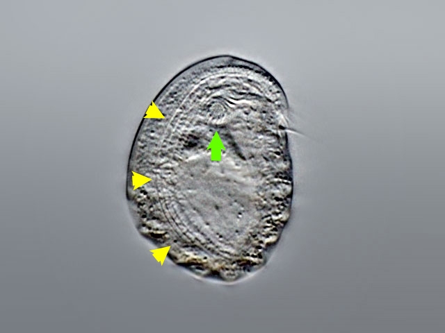 In einem weiteren Bild sieht man das rechte Wimpernfeld  (gelbe Dreiecke), sowie die Reuse (grüner Pfeil) :
