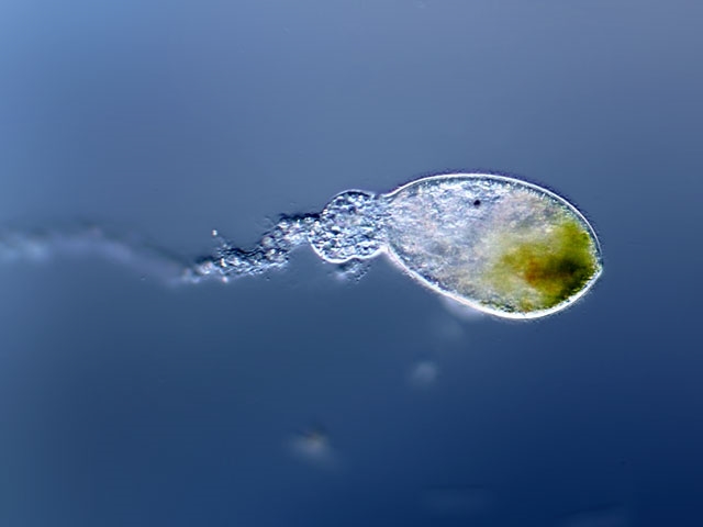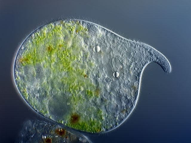 in einer Plankton-Probe vom letzten Wochenende fand ich recht häufig (ca 3 Exemplare pro Tropfen) diesen seltsamen Ciliaten, den ich für Dileptus tracheloides halte. Von der Form her und der Bewegung ist er mit Paradileptus elephantinus vergleichbar, besitzt allerdings Zoochlorellen, die sich bevorzugt im terminalen Bereich befinden. Hier ein leicht gequetschts Exemplar: