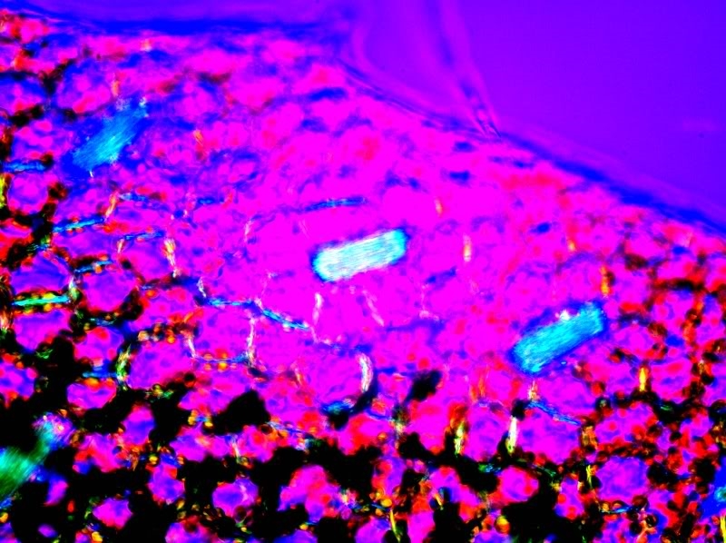 hier ein Photo der Kristallbündel in einem Sproßglied der Kleinen Wasserlinse. Da die Aufnahme durch die Blattoberfläche angefertigt wurde, läßt die Schärfe der Abbildung der Kristallnadeln leider etwas zu wünschen übrig.