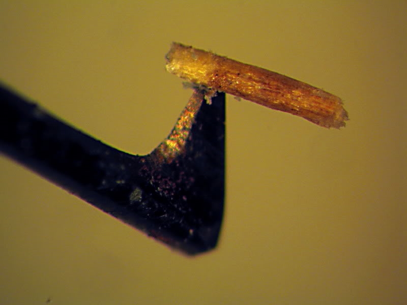 Ein 1 mm langer senkret im Zeigefinger meiner Frau steckender Spreißen. Nur mit dem Haken rauszukriegen, die feinen Pinzetten sind immer abgerutscht. Das längere bräunliche Stück könnte leicht blutig sein.
