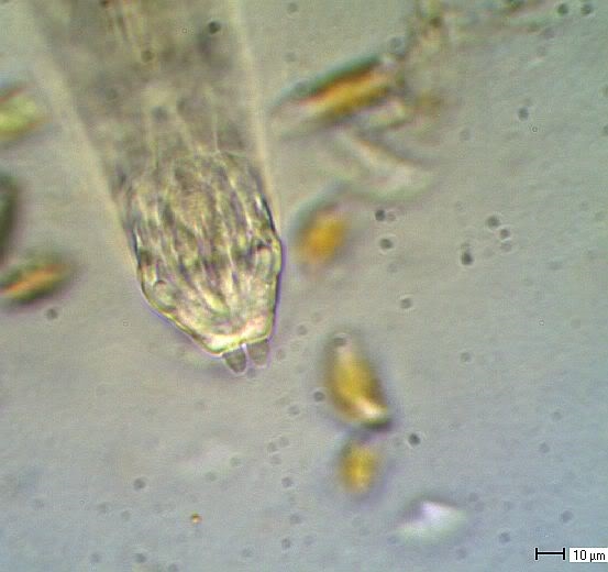 Deine Fotos und auch die Dokumentation werden von Tag zu Tag besser! Dein Rädertier ist mit Sicherheit kein Rhinoglena, sondern ein bdelloides Tier. Aufgrund der Lage der "Augen", die sehr schon rausgekommen sind, würde ich auf Philodina tippen. Die Anhängsel am Rumpfende sind zwar der Versuch, die Zehen zu dokumentieren, jedoch wahrscheinlich eher die Sporne, die vor den Zehen sitzen. Insofern ist eine Artbestimmung nicht möglich. Leider zeigst Du das Tier auch nicht rädernd, so dass wichtige Merkmale nicht erkennbar sind.
