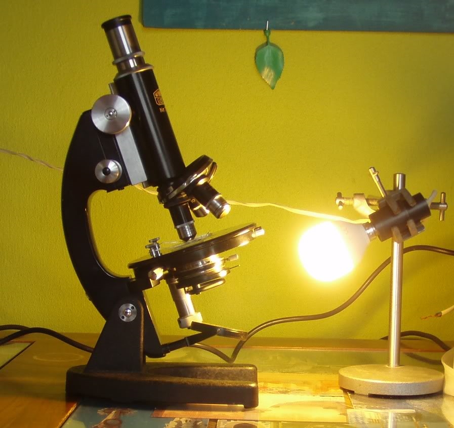 The picture below shows the Winkel-Zeiss microscope, it has a simple 2-lens NA 1.2 Abbe condenser. Te light source is one of those new generation fluorescent bulbs you can buy at the supermarket, they give a very even illumation and are perfect for a microscope with a mirror.