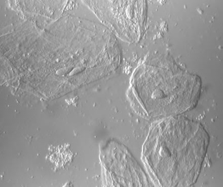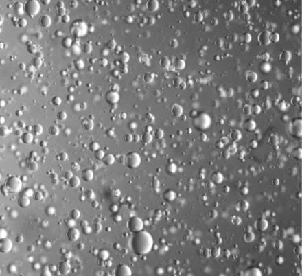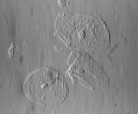 hier eine Aufnahme (analog und unbearbeitet) aus dem Blaualgenbereich mit dem DIK nach Pluta. Dieser Interferenzkontrast hat den Vorteil, dass er nicht an bestimmte Objektive gebunden ist. Ich habe ihn für das Zeiss-WL-Stativ adaptiert. Der abnehmbaren Kondensorträger wurde für den PZO-Kondensor umgebaut. Die Ringschwalbe und Ringschwalbenaufnahme am Interferenzkopf  passen mit hinreichender Güte für die Zeiss-Mikroskope aus der Endlichreihe. Das Foto wurde mit dem Objektiv Neofluar 40 und dem Okular S-KPL 10 gemacht und ist (natürlich) geblitzt.