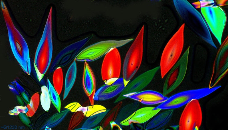 vielen Dank für die interessanten Links! Ich hatte inzwischen auch etwas gegugelt und über diese Zusammenhänge mit den Flüssigkristallen gelesen, alles in allem doch eine sehr komplexe Materie. Die beiden letzten Links konnte ich bisher nicht aufrufen. Aber mir fehlen auch die chemischen Grundlagen für ein genaueres Studium, und so bleibt es hauptsächlich bei der Ästhetik. Vielleicht ist sie ja manchen etwas zu bunt ("farbtriefende Fotos"), trotzdem Herrn Binder nochmal großen Dank für die unscheinbaren Gelklümpchen!