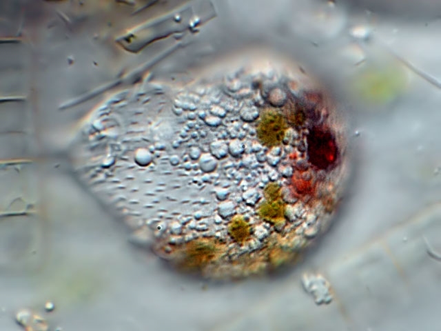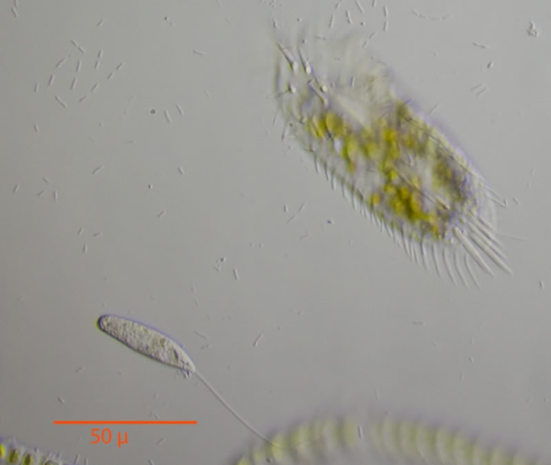 besten Dank euch beiden für die Bestimmung. Ich hatte Peranema trichophorum nach der Sichtung des " Wassertropfens " auch im Sinn, jedoch die Beschreibung, dass die Geißel sich nur an der Spitze schlängeln würde, ließ Zweifel aufkommen. Bei meinen Beobachtungen schlängelte sich die gesamte Geißel hin und her, bei "schneller Fahrt geradeaus " wurde die Spitze abgeknickt und nicht bewegt. Auch konnte ich nicht die " beborsteten Spiralleisten " sehen. ( Wenn sie überhaupt ohne besondere Präparation zu sehen sind ). ( Text siehe " Das Leben im Wassertropfen ",8. Auflage, Seite 152 Nr.10 Text und Seite 153 Nr. 10 Bild. )